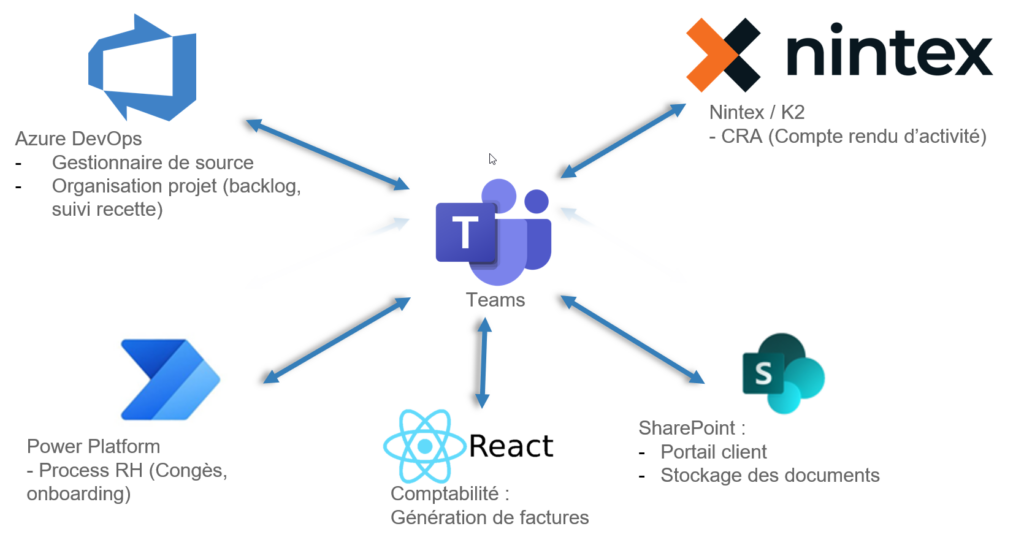 Pour commencer, gérer une équipe projet, située sur différentes localisations physiques, ce n’est jamais simple ! De plus, on utilise plusieurs outils en interne (SharePoint et teams pour le collaboratif, DevOps pour la gestion de projet, K2 (quand même 😀 ) pour l’informatisation d’une partie de nos processus et quelques autres pour notre fonctionnement interne). Et pour finir, l’intégration de nouveaux collaborateurs dans les équipes nécessitent un enchainement de tâches chronophages côté IT, et un accompagnement pour comprendre l’utilisation des outils mis à sa disposition et des différents processus interne.
